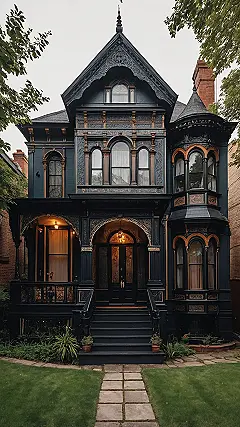 Wow, check out this Victorian home! It’s like someone said, “Let’s put ALL the fancy stuff on this house and then some!” The dark blue-grey paint with all that swirly gold trim makes it look super dramatic and totally Instagram-worthy. You’ve got windows everywhere – big arched ones, tiny ones peeking out from the roof, and even a whole curved section that probably gets amazing light. Cleaning all those panes would be a serious workout, but hey, at least you’d have the fanciest view around. This place practically screams, “I’m important, and I definitely have a backstory!”
