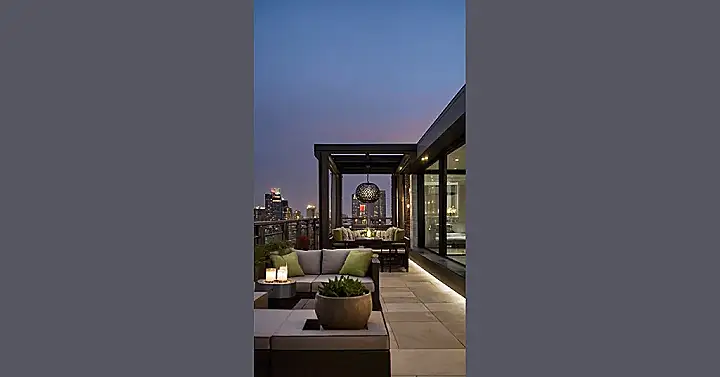 But wait, there’s more! That awesome glass-enclosed patio is perfect for those chilly evenings. You can still enjoy the fresh air and amazing view without freezing your toes off. Plus, it adds a touch of modern coolness that’s super trendy. Who needs a vacation when you’ve got a rooftop paradise like this?