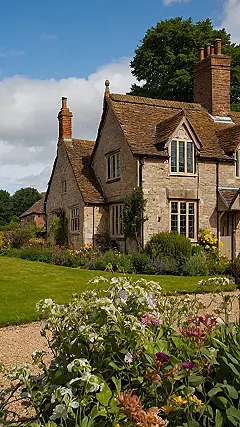 This charming English village house is straight out of a fairytale! With its stone walls, sloping roof, and quaint chimneys, it’s easy to imagine a family happily living inside. The house looks like it’s tucked away in a secret garden, surrounded by beautiful blooming flowers and a lush green lawn. It’s the kind of place you’d dream about escaping to, where you could sip tea on the porch and watch the clouds drift by.