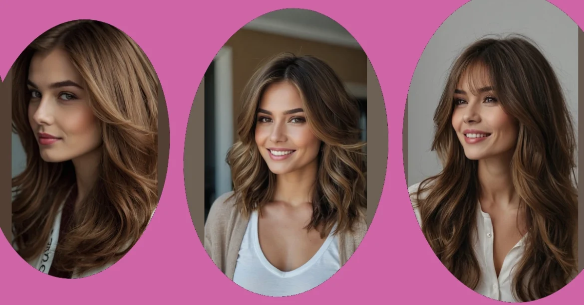 This hairstyle is seriously amazing! It’s like the model is wearing a waterfall of gorgeous, perfectly layered brown hair. Those long layers add so much volume and movement—it’s the kind of hair you just want to run your fingers through (don’t actually do that without permission though!). The side-swept bangs are super cute and give the whole look a really soft, trendy vibe that’s perfect for school, hanging out with friends, or even that fancy family dinner. This style is totally trending for women right now, and it’s easy to see why!