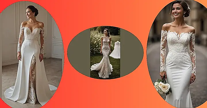 And let’s not forget all those incredible details on this gown – the intricate lace patterns look like they were woven by a team of fashion-forward fairies. The off-the-shoulder sleeves add a touch of elegant charm, making you feel like you stepped straight out of a fairytale, ready to walk down the aisle (or at least glide with extreme grace). Just remember to practice your ‘mermaid’ sashay a few times before the big day, so you don’t trip over all that beautiful train while you’re busy dazzling everyone with that amazing smile!