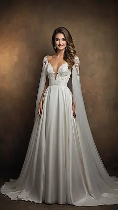 The woman in the picture looks absolutely ready to conquer the wedding aisle, doesn’t she? Her dress is seriously giving off “goddess vibes” with that elegant lace bodice and those flowy, cape-like sleeves that make you think she might just float down the aisle. You can just tell this gown isn’t just pretty; it’s got that secret power structure underneath, probably a fantastic corset working hard to give her that perfectly snatched silhouette. It’s like having a built-in superhero suit that makes sure everything stays perfectly in place while she’s busy shining brighter than the disco ball at prom.