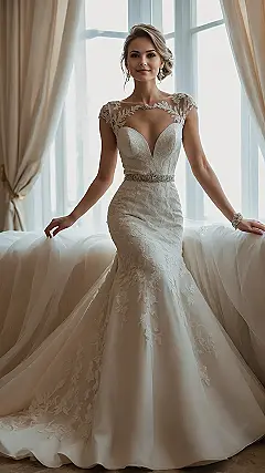 Look at this ivory wedding dress! It’s giving major main character vibes, right? The lace top is stunning, and that skirt? It’s basically a cloud you get to wear, complete with an epic train that probably has its own zip code. Just imagine trying to wear something this fancy down a busy street, maybe having to dodge a stray skateboarder or a pigeon. You’d need a whole crew just to make sure that train didn’t get run over or pick up every single piece of confetti left from the last parade!