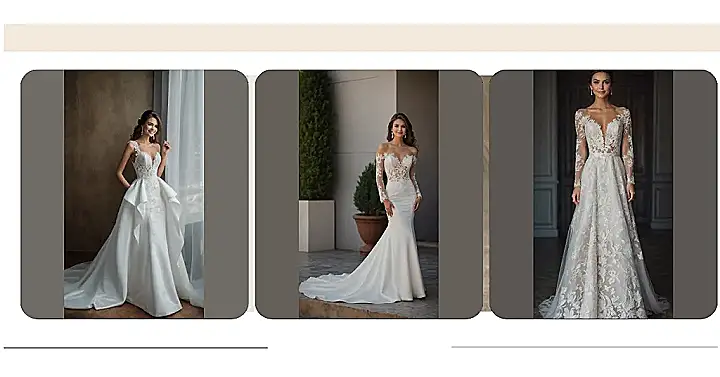 This dress proves you don’t need a huge, over-the-top gown to drop jaws. The way it flows effortlessly down, hugging all the right places before flaring out into a graceful train, is pure elegance without any fuss. Those sheer, lacy sleeves? They’re like a secret superpower, adding a touch of fairy-tale magic without making you look like you got tangled in curtains. It’s all about looking effortlessly gorgeous and confident, like you just woke up flawless and decided to get married. This is the kind of dress that says, “Yeah, I’m getting married, and I still look cool enough to hang out with my friends after!”