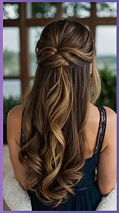 Looking for a bridesmaid hairstyle that’s both elegant and easy to manage? This half-up, half-down style is a total winner! It’s got a touch of fancy with the twisted top, but it still lets those gorgeous curls flow freely, so you can dance the night away without worrying about your hair falling out. It’s like the best of both worlds: classy and fun!