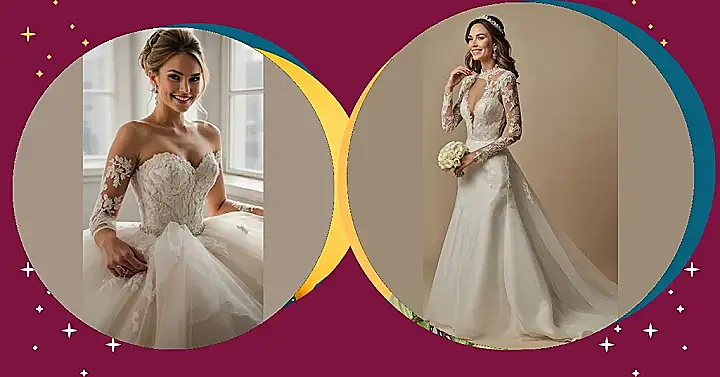 This wedding dress is like a fairytale come true, but with a twist! It’s got this gorgeous, long-sleeved lace top that’s super elegant, almost like a princess, but then it’s got this daring neckline that shows just a peek of skin. It’s like the designer said, “Let’s have some fun with tradition!” It’s not exactly “off the shoulder,” but it’s definitely got that flirty vibe without being too revealing. It’s the perfect dress for a bride who wants to feel confident and beautiful but also wants to stay true to her style, however “true” that may be.