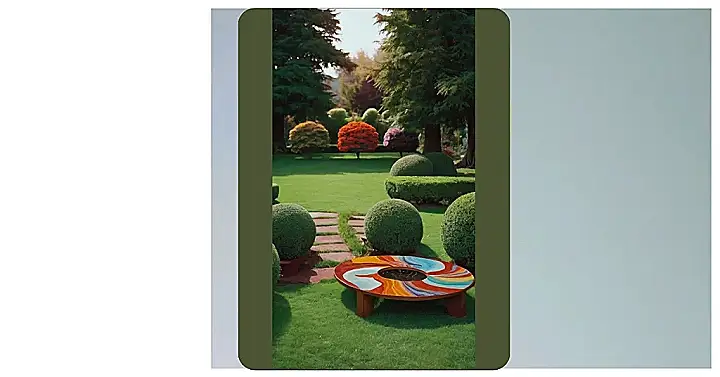 This garden is so fancy, it’s like stepping into a secret world. It’s not your average backyard, that’s for sure! You’ve got trees that look like they’re straight out of a fairytale, and then there are these perfectly round bushes like giant green meatballs. But the real show-stopper is this swirling, colorful table in the middle. It’s like a giant, artistic pizza, ready to be devoured by your imagination!