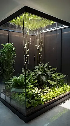This picture shows a super cool indoor garden! It looks like someone built a mini-greenhouse right inside their home. It’s like a tiny jungle in a glass box. You can see plants growing everywhere – on the floor, on the walls, even on the ceiling! Imagine being a plant living in this awesome indoor garden! You’d be surrounded by other green friends and have plenty of sunshine to help you grow.