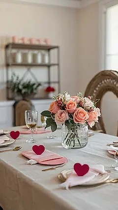 Seriously though, who needs a fancy restaurant when you can create this level of magic at home? It’s all about the details, from the heart-shaped confetti scattered across the table to the adorable little rosebuds peeking out from the centerpiece. Plus, red and pink? It’s the ultimate Valentine’s Day color combo that screams “love is in the air”! This is a table setting that’s both elegant and totally fun – perfect for a special dinner with your special someone.