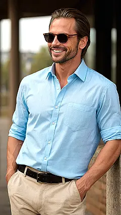 This guy’s rocking a shirt outfit that just screams “I’ve got things handled, but also I’m probably thinking about pizza.” That light blue button-up is practically a superhero cape for casual cool, with the sleeves rolled up like he’s ready to ace a presentation or maybe just perfectly flip a pancake. It’s the kind of shirt that makes you look smart enough for a parent-teacher conference but chill enough to win a staring contest with your dog. Plus, that color is so refreshing, it’s like a cool breeze on a hot day – definitely no fashion sweat here!