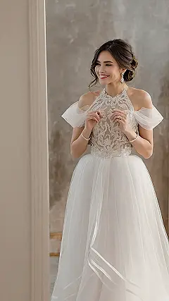 Wow, check out this engagement dress! It’s like something straight out of a fairytale, but way more modern and sparkly. Imagine yourself twirling on the dance floor, feeling like a total queen in this gorgeous gown. The shimmery details are stunning, and the high neck with the peek-a-boo cutout is totally unexpected and fabulously stylish. It’s the perfect mix of elegance and a little bit of “wow, I’m totally rocking this!” attitude – everything you need for your special celebration!