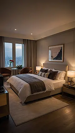 Look closer at all the cool details, like the soft glowing lamps that make late-night reading (or, let’s be honest, scrolling) super inviting, and that fuzzy rug just waiting for your feet in the morning. This single bedroom isn’t just a place to sleep; it’s a whole mood. You get to decide exactly how many decorative pillows are “too many” (the answer is never!), and the only mess you have to worry about is your own glorious pile of clothes on that bedside chair. It’s basically a fancy hotel room, but you get to live there permanently without the awkward mini-bar prices.