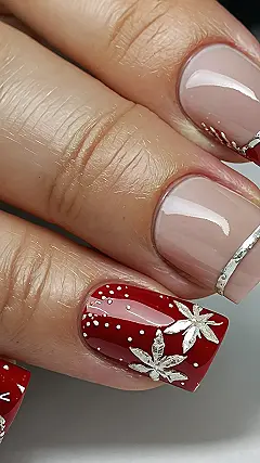 These nails are seriously festive! Imagine showing up to your holiday party with these beauties – you’d totally steal the show! It’s like a mini Christmas wonderland on your fingertips. The red and silver combo is super chic, and the little snowflakes and sparkly dots add a touch of whimsy. Who needs a Christmas tree when you’ve got this much festive flair?