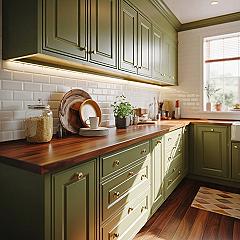 Embrace a tranquil olive green kitchen aesthetic with Light Sage Kitchen cabinets harmonizing beautifully with warm earth tones. This small kitchen design inspiration creates a cozy and inviting atmosphere through a carefully curated color scheme with green.