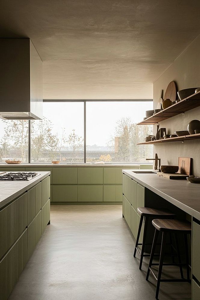 Experience an airy, sophisticated atmosphere enhanced by natural textures and clean lines, perfect for those seeking a serene yet functional contemporary green kitchen.