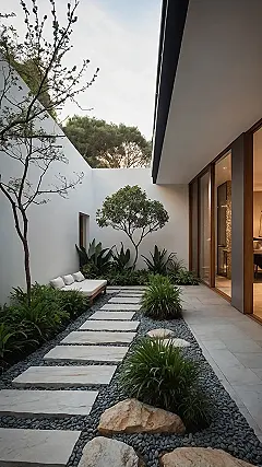 The next time someone complains their outdoor space is too small for a garden, just show them this picture! It’s proof that you don’t need acres to create an epic chill zone; sometimes, all it takes is a clever design and a good eye for greenery. This place practically screams “relax here,” with its smooth white walls bouncing sunlight around and those perfectly placed trees adding a touch of natural elegance. It’s like finding a secret tropical escape tucked right into the side of a modern building – who knew you could fit so much cool into such a tidy area?