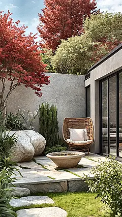 Who knew a garden could be this stylish without needing a GPS to navigate it? Look at those amazing red trees doing their dramatic autumn thing – they totally make this compact space feel vibrant and alive, even next to those cool, calm gray walls. It’s got big, chill rocks that look like giant, peaceful marshmallows, and stepping stones that lead to… well, probably that awesome comfy chair again! This tiny outdoor room is proof you don’t need a huge backyard to create a spot that feels super grand and totally your own.