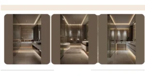 The whole room has a cool vibe, with the dark marble wall and the sleek furniture. That marble looks like it has a cool story to tell, like a secret map hidden in the veins of the stone. It’s the kind of room that makes you feel like a movie star, even if you’re just in your pajamas! It’s like stepping into a magazine photo! You could almost imagine a fancy party happening here, with sparkling champagne and guests dressed in their best outfits! Maybe you’ll even get to be invited. 😉