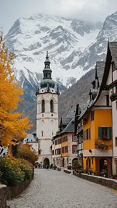 Talk about a fashion statement from Mother Nature! This European gem apparently decided it couldn’t pick between a cozy autumn vibe and a dramatic snowy mountain backdrop, so it just went with both. You’ve got those fiery yellow trees on one side, practically screaming ‘pumpkin spice latte,’ while behind the fancy church tower, colossal snow-capped peaks are just chilling, looking majestic. It’s the kind of place where you’d take so many photos, your phone’s storage would throw a tantrum, but totally worth it for those ‘I’m basically living in a fairytale’ bragging rights.