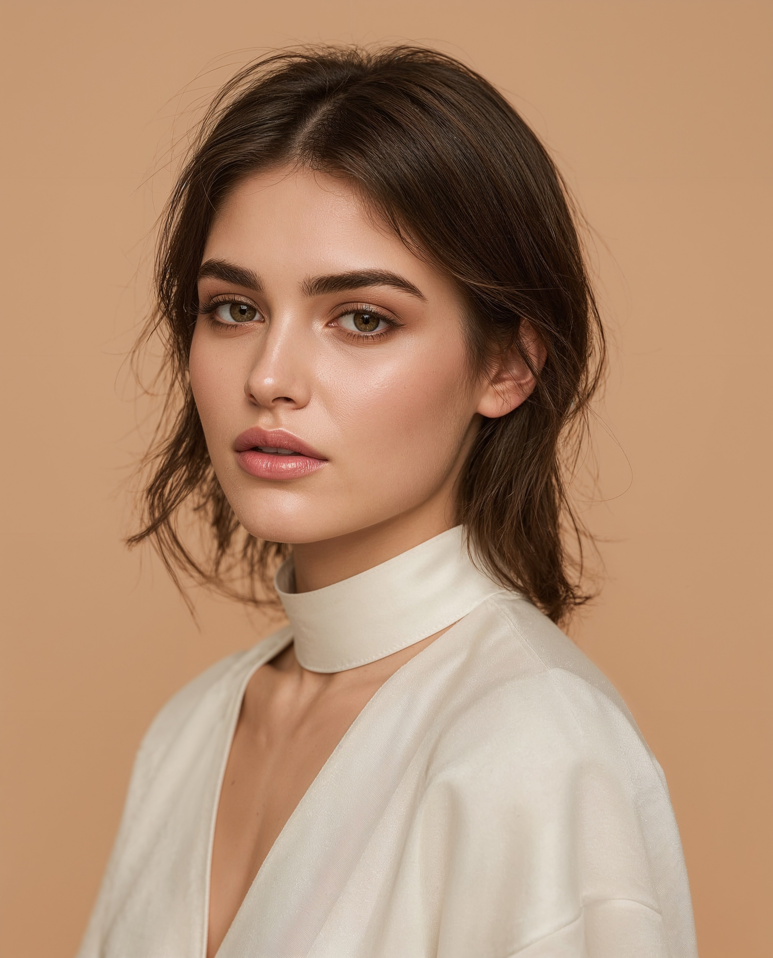 This soft brown wedding makeup enhances natural features, complemented by chic highlights and a refined lip, embodying the wedding hairstyle simple elegance every bride desires.
