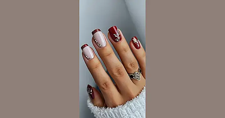 OMG, check out these nails! They’re totally trendy and perfect Christmas inspo. Imagine rocking these beauties at your holiday party – everyone will be asking where you got them done! The mix of creamy nude with that deep, festive red is seriously chic. Plus, those little gold snowflake and branch details? They’re like tiny works of art, way more sophisticated than reindeer and candy canes (although those are cute too!). They’re the perfect blend of elegant and fun – ready to steal the show this Christmas!