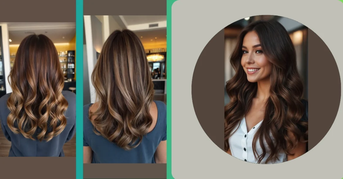 This image shows a gorgeous model with hair that’s like a warm, yummy caramel latte – perfect for fall! It’s a rich brown with some lighter streaks that make it super-dimensional. Imagine walking into school with this hair color – you’d be turning heads for sure!