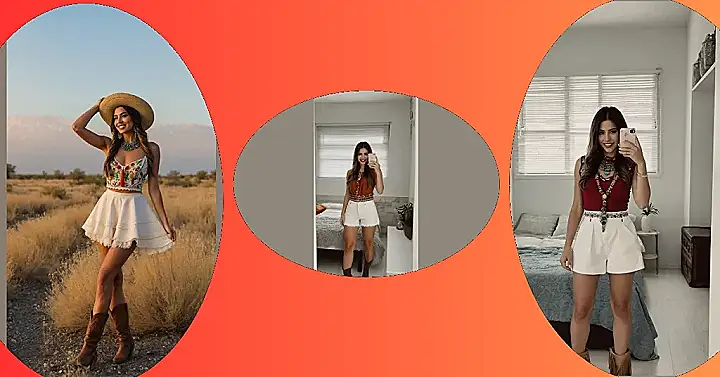 Who knew looking this good could involve actual boots? This outfit is giving us major ‘rancho chic’ vibes, making you wonder if she’s about to hit a fancy hoedown or just conquer her day with some serious style. That top with all the cool, colorful patterns looks like it brought its own party, and those white shorts are the perfect sunny sidekick for adventure. It’s the kind of look that says, “I’m ready for anything, from a casual hang to starring in my own western rom-com.”