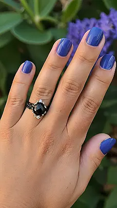 This spooky season, everyone’s rocking dark nail colors, and this hand is no exception! Those dark blue nails are totally on-trend for Halloween. But the best part? That sparkly ring with the black gem looks like it belongs to a real-life witch! I bet that ring has some magical powers, like making your pumpkin carving skills super awesome.