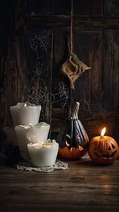 Surrounded by a stack of wavy, bright candles trying their best to add a touch of eerie elegance, these pumpkin pals are totally setting the mood. If you peek closer, you’ll spot some neat spiderwebs on the old wooden door in the background, plus a quirky little hanging decoration that isn’t quite a bat but definitely belongs in a haunted house. It’s the perfect blend of spooky and sweet, guaranteeing your screen will be the coolest backdrop for all your ghostly group chats without giving anyone actual nightmares!