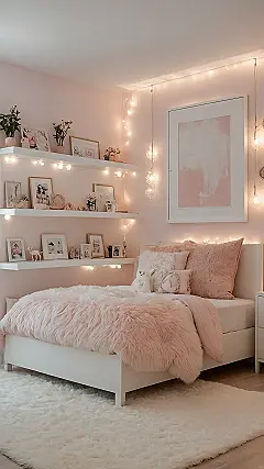 Walking into this room feels like getting a giant, fluffy hug, doesn’t it? With all that soft pink and crisp white, it’s basically a cloud nine hideaway designed for peak coziness. Just look at that bed, piled high with plush pillows and a throw that screams ‘nap time champion’ – good luck trying to get up in the morning! Those sparkling fairy lights strung along the wall and the cool, drippy light fixture on the ceiling make every evening feel magical, perfect for chilling with friends or diving into a good book. It’s the kind of place where every selfie looks amazing, no filter needed.