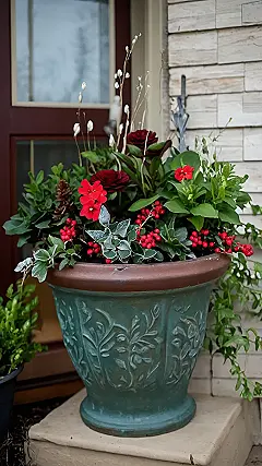 This planter is the ultimate winter warrior! Even though it’s chilly outside, this pot is bursting with life. The green leaves, ferns, and that bright red flower are like a little piece of spring hanging out on the front porch. It’s proof that even when it’s freezing, there’s still beauty to be found. It’s like this planter is saying, “Winter? No problem, I’m bringing the sunshine!”