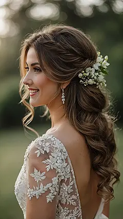 Finding the ‘best bridal hairstyles 2025’ isn’t just about looking good in photos; it’s about feeling awesome when you’re walking down the aisle, trying not to trip, and maybe tearing up a little. This amazing style, with its beautiful blend of elegant waves, a cool braid, and those perfectly placed flowers, totally hits the mark. It’s sophisticated enough for a fancy wedding but still has that chill, ‘I’m just here to get married and have fun’ attitude. Plus, it pairs perfectly with those sparkly earrings and the gorgeous lace on her dress, making her look ready for her own rom-com movie montage!