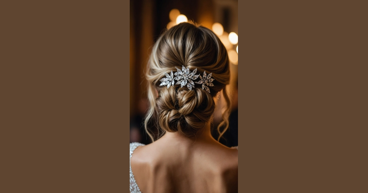 Getting ready for a wedding often feels like a secret mission to make sure your hair behaves all day. But with a classic updo like this one, featuring those perfectly swept-back layers and a super fancy sparkling hairpiece, your mane is officially ready for action! No more worrying about your hair flopping into the mashed potatoes during the reception or getting caught in Uncle Bob’s enthusiastic dance moves. This isn’t just a hairstyle; it’s a declaration that you’re here to celebrate, look fabulous, and probably outshine the disco ball (sorry, disco ball, you tried).