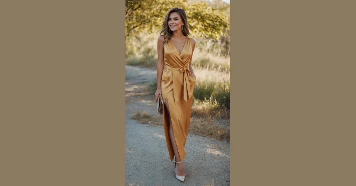 We all know the mission: finding that perfect wedding guest outfit that says “I came to celebrate, not to upstage the bride (much!).” Well, check out this golden goddess look! This stunning satin-wrap dress is basically a cheat code for looking effortlessly chic and totally on-trend. Its strapless design and sassy bow belt mean you’ll be twirling on the dance floor feeling like a million bucks, without actually spending it. Plus, that hint of leg showing through the wrap? Chef’s kiss! It’s definitely one of the latest wedding guest outfits that will get everyone talking (in a good way, of course!).