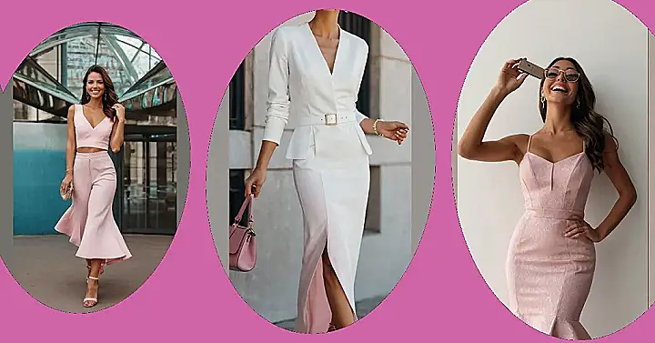 This girl is totally owning the “women pink outfits” trend! Look at her gorgeous, blush-pink dress – it’s like a fairytale come to life, but way more fun. It’s fitted but flirty with that cute little ruffle at the bottom, perfect for a party or even just hanging out with friends. She’s clearly ready for anything, whether it’s snapping a selfie or conquering the world, one perfectly pink outfit at a time!