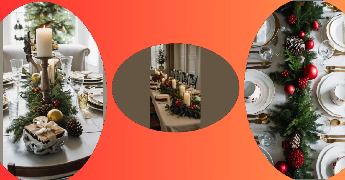 This picture is like a Christmas explosion of festive cheer! Imagine all the delicious food, happy family members, and maybe even some silly stories around this beautifully decorated table. That gorgeous garland is the star, winding its way down the center like a holiday river of pine, pinecones, and shiny red ornaments. It’s almost too pretty to eat at – almost!