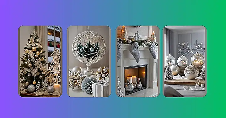 This picture is like a Pinterest board exploded! It’s totally dreamy, all shimmery silver and icy blue. Imagine a giant sparkly orb filled with tiny ornaments and some seriously chic greenery – it’s like a miniature snow globe, but way more stylish. Then you’ve got these amazing starburst decorations that look like they’re made of frozen moonlight, and a fluffy pinecone ornament that’s almost too pretty to touch (almost!). It’s the perfect inspiration for a white Christmas decor scheme that’s elegant, not fussy.