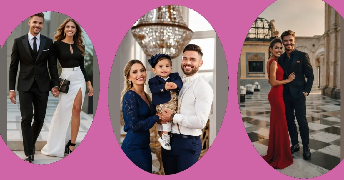 This picture is the perfect example of a couple’s Christmas party outfit inspiration! Mom’s stunning blue dress is elegant and festive, while Dad’s crisp white shirt and dark pants are super stylish. And let’s not forget the cutest little accessory – their adorable mini-me, all dressed up in a sparkly gold and navy outfit. They’re ready to steal the show at any Christmas party, proving that family is the best accessory of all!