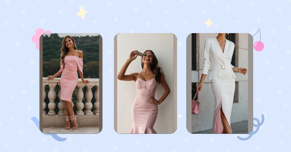 This picture shows a woman rocking a seriously stylish pink outfit! It’s like a princess-meets-modern-day-chic kind of vibe. That pale pink dress is so flattering, and the cut is super trendy – it’s the perfect blend of girly and grown-up. She’s accessorized perfectly too; the beige shoes and bag match beautifully without being boring, and the little belt adds a touch of elegance. Seriously, this look would slay at any party or special event!