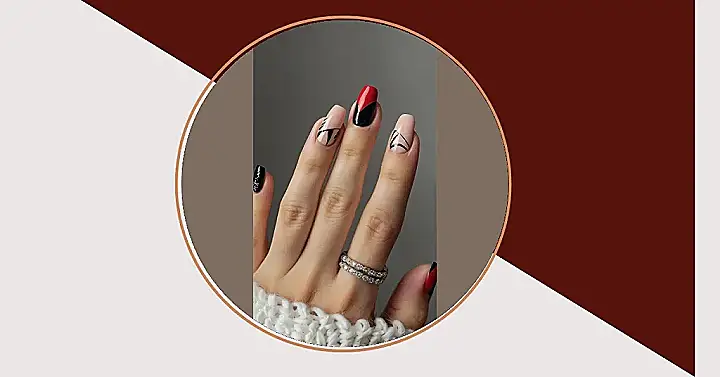 These nails are totally rocking the “red glamour” look! Imagine walking into a party with these bad boys – everyone would be asking where you got them done. It’s like a sophisticated spy’s manicure, all sleek black lines and pops of bold red. The neutral beige nails are so chic too, making the red and black really pop. Maybe you’re off to a secret mission, or maybe you just feel like being extra fabulous. Either way, these nails are totally ready for anything!