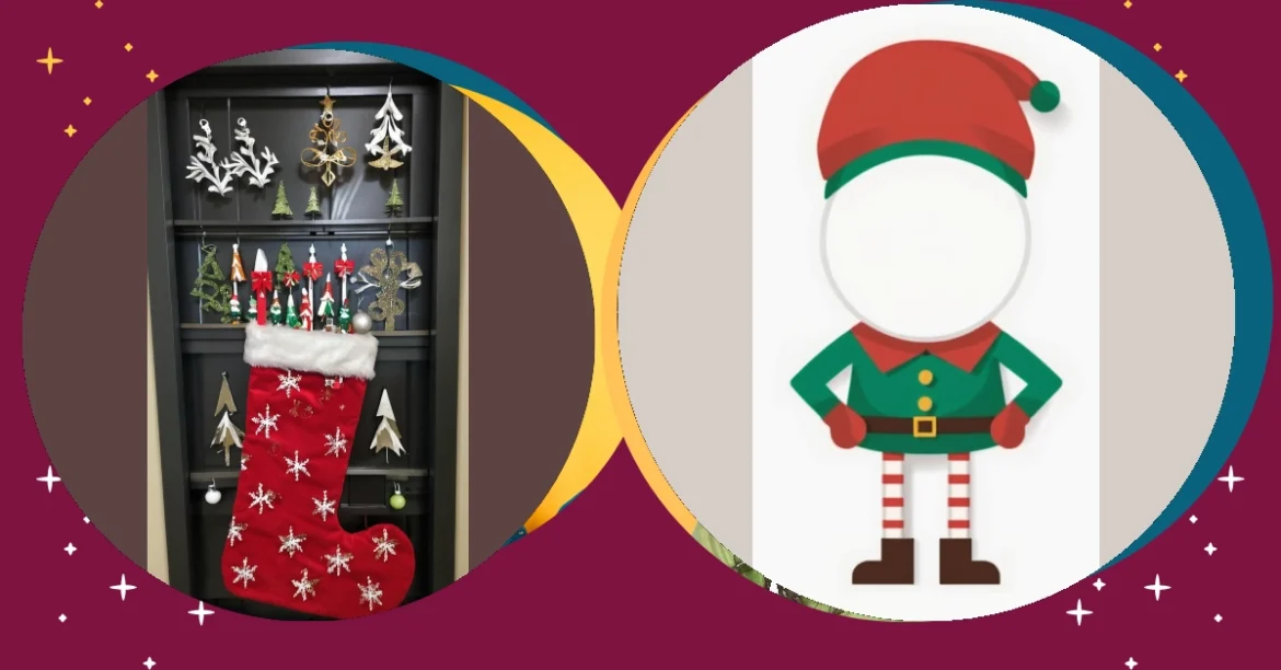 He’s got the hat, the holly, the cute little green suit, and those fabulously striped elf socks! All he needs is YOU (or maybe a volunteer from the office…someone who appreciates a good giggle!). He’s clearly not ready for his close-up, but this elf’s got all the ingredients for some seriously fun Christmas shenanigans. Now get creative and make this headless holiday hero the star of your Christmas office decorations!