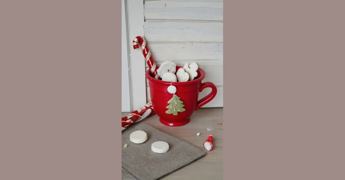 This picture is pure Christmas craft magic! Imagine a giant mug, the kind you’d use to drink a whole gallon of hot cocoa on a snowy day (don’t actually try that, though!), filled to the brim with adorable little Christmas cookies. They’re all snowy white and perfectly imperfect, like a gingerbread family that just had a snowball fight. There’s even a tiny, charming Christmas tree hanging off the side—it’s the cutest holiday decoration I’ve ever seen! Plus, a candy cane leans against it, adding to the festive chaos. It’s the kind of craft project that makes your heart melt like a marshmallow in that hot cocoa I mentioned.