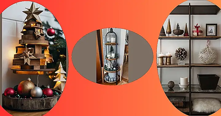 This image shows off some seriously stylish Christmas decor ideas using standing shelves! Forget the usual cluttered mantle – these shelves are like a mini-Christmas village, all organized and festive. It’s like someone took all the coolest Christmas ornaments and tiny trees, gave them a cozy home on these shelves, and then sprinkled in some candles and other cute stuff just to make it extra magical. You could totally copy this style yourself, and it would be super easy to customize to fit your own awesome personality and decorations!
