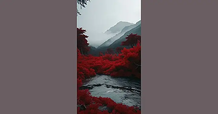 This picture is like someone took a normal mountain scene and dipped it in a vat of cherry Kool-Aid! Seriously, everything’s this crazy, vibrant red. It’s like those plants are wearing tiny red sweaters and decided to have a massive party in the mountains, right next to a cool, calm river. I bet the air smells like berries and adventure! It makes me want to grab my hiking boots and explore this fiery landscape – but maybe bring an extra sweater because it looks a little chilly up there.