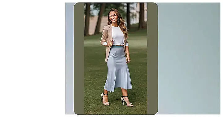 This picture shows a totally stylish outfit – a beautiful light blue midi skirt and a beige blazer. It’s perfect for a fancy lunch date or maybe even a super important school presentation (if you’re feeling extra confident!). But here’s the kicker: the model is rocking some seriously chic heels. The question is, could this look work just as well with sneakers? We’re thinking maybe some stylish white sneakers or even some cool patterned ones could make this a whole new level of comfy chic! Imagine strolling through the park, looking amazing and feeling super comfortable all at the same time.