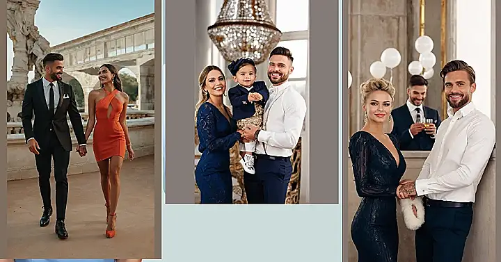 This picture is the perfect example of a couple’s Christmas party outfit inspiration! Mom’s stunning blue dress is elegant and festive, while Dad’s crisp white shirt and dark pants are super stylish. And let’s not forget the cutest little accessory – their adorable mini-me, all dressed up in a sparkly gold and navy outfit. They’re ready to steal the show at any Christmas party, proving that family is the best accessory of all!