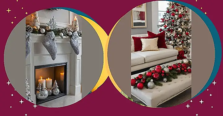 This picture is seriously festive! Just imagine snuggling up by this fireplace on a snowy Christmas Eve. The shimmering silver ornaments, the cozy gray stockings, and those flickering candles—it’s like a magical winter scene straight out of a movie! It shows how easy it is to create a super chic “white Christmas” look, even if you don’t have a mountain of snow outside your window. All it takes is a little bit of sparkle, some soft silvery tones, and the warm glow of candlelight to transform your fireplace into a winter wonderland.