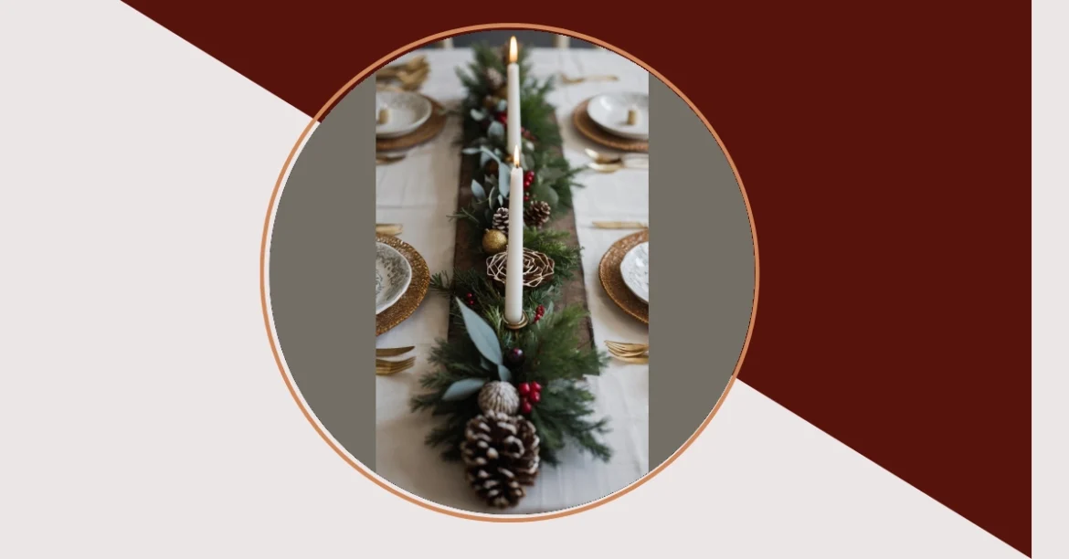 This holiday tablescape is seriously goals! Imagine the delicious smells wafting from the kitchen as you admire this stunning centerpiece. It’s like a winter wonderland exploded onto your dining table, with a gorgeous garland of pine, pinecones, and shiny ornaments weaving its way down the middle. That candle is the perfect touch – it’s like the table is all lit up with holiday cheer! I bet everyone feels cozy and festive just looking at it.