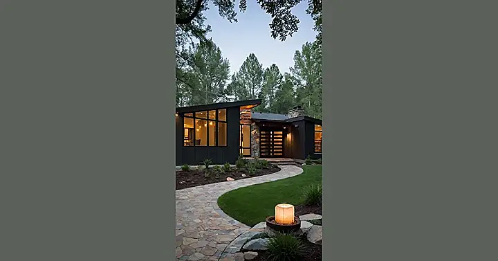 This house isn’t your grandpa’s ranch house! It’s like a sleek, dark spaceship landed in the woods, but instead of aliens, it’s got comfy couches and probably a really cool kitchen. Imagine the epic movie nights you could have, with all those huge windows letting in the twilight glow! That stone walkway looks like it leads straight to a fairy tale, or at least, to an awesome backyard bonfire.