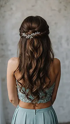 Check out this hairstyle! It’s basically the hair equivalent of having your cake and eating it too. It’s got those gorgeous waves flowing free, but the top half is cleverly pulled back, keeping it tidy and showing off your lovely face. Plus, adding a sparkly clip like the one here? Chef’s kiss! It just elevates the whole look without being too over-the-top. This kind of half-up, half-down vibe is perfect for bridesmaids because it looks elegant, stays mostly put, and lets you focus on supporting the bride and, you know, grabbing snacks without your hair ending up in them.